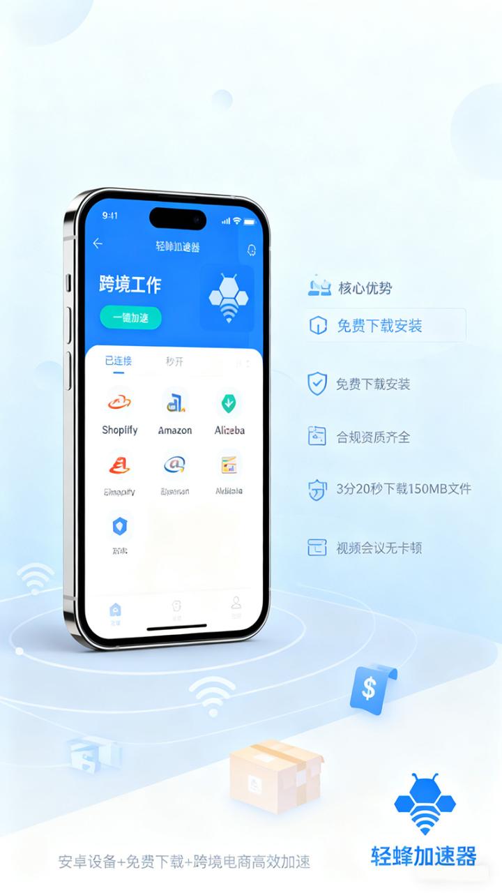 一次行业交流会上,认识了做跨境女装的张姐,她听说我的困扰后,给我推荐了轻蜂加速器。她说自己用了一年多,安卓手机和平板都能用,稳定又合规,从来没出过问题。抱着死马当活马医的心态,我搜索“轻蜂加速器app下载”,在官网找到了安卓版本。这款安卓加速器免费下载安装的过程特别顺畅,没有捆绑软件,也没有多余的广告弹窗,跟着提示一步步操作,三分钟就安装完成了,就算是不擅长技术的人也能轻松上手。